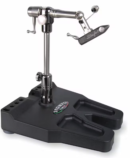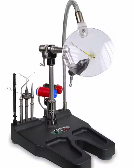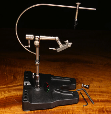 Morsa de banco de acción rotativa de 360° grados .El eje de acero inoxidable gira a través de dos rodamientos de bolas de precisión. Otras características importantes: mordazas intercambiables, bloqueo de gancho por dispositivo de palanca "super suave", tensión giratoria ajustable, movimiento giratorio suave, posición de bloqueo en cualquier ángulo, altura ajustable, reversible para atar con la mano izquierda. Otros accesorios incluidos: soporte de bobina de forma redondeada, alicate de paracaídas, clip de material de resorte ajustable, soporte de rosca de pivote, llaves allen y manual de instrucciones.